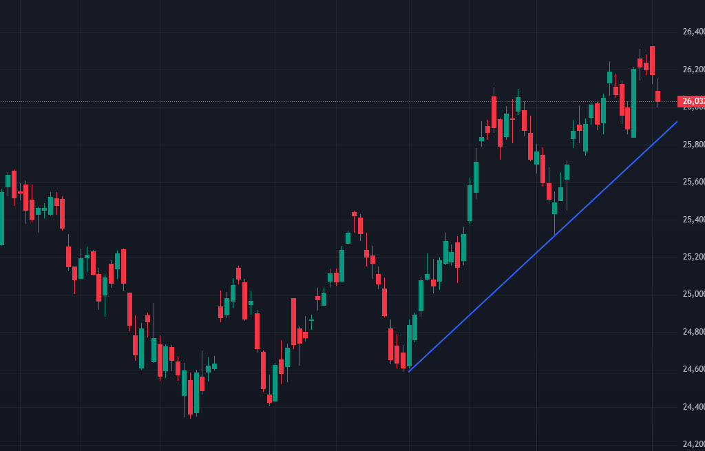 - Support: 26,000 is the final line of defense. Today’s low was 25,997, which was bought into. If this breaks tomorrow, the index could slide to 25,850.